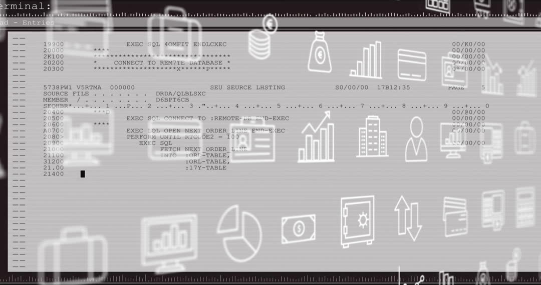 This visual features an animation of business icons overlaying a data processing terminal screen. It combines digital data visuals with conceptual business graphics, providing an abstract representation of modern financial technology and global business connections. Ideal for presentations, website banners, or articles focused on technological advancements in data management and global commerce.
