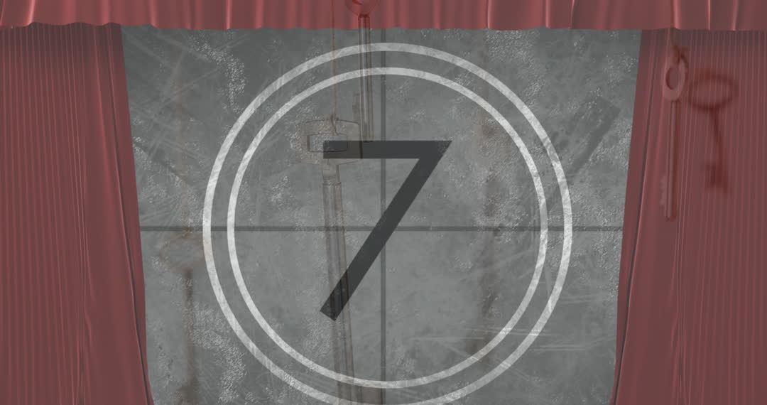 This animation depicts a red curtain overlay with an old film countdown on display, featuring the number seven, and shadowy keys in the background. It can be used in projects relating to cinema, vintage film themes, or conceptual digital interfaces. Suitable for creative storytellers, content featuring film history, or backgrounds for thematic visual media projects.