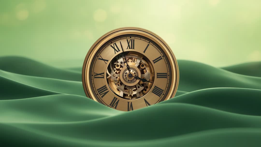 AI Generated Image. Captivating video clip captures an antique brass clock with visible gears rotating rhythmically on undulating green waves, symbolizing the passage of time and harmony between mechanics and fluidity. Ideal for projects highlighting innovation, mechanical beauty, or journey through time concepts.