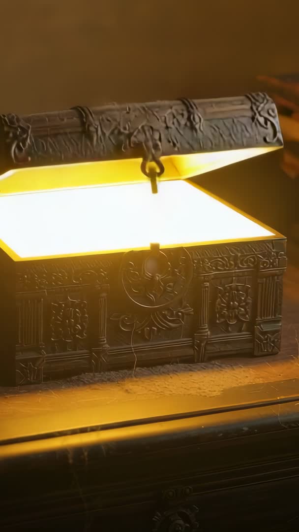 AI Generated Video. Close-up vertical clip showing ornate antique chest opening and emitting warm golden light through seam, key swinging and dust motes drifting across carved surface. Mood conveying mysterious, magical, suspenseful atmosphere ideal for storytelling shots and teaser moments. Use for social media reels, vertical ads, film or game trailer inserts, book trailer and cover reveal animations, museum or antique shop promos, Halloween and escape room marketing. Editing suggestions: apply slow push-in zoom, add soft chime or low suspense pad, enhance warm tones with color grade, place overlay text or logo in upper or lower thirds, loop clip for seamless repeats. Technical notes: vertical 9:16 composition, strong highlights at seam may require exposure adjustment, high contrast between glow and dark surfaces creating cinematic silhouette.