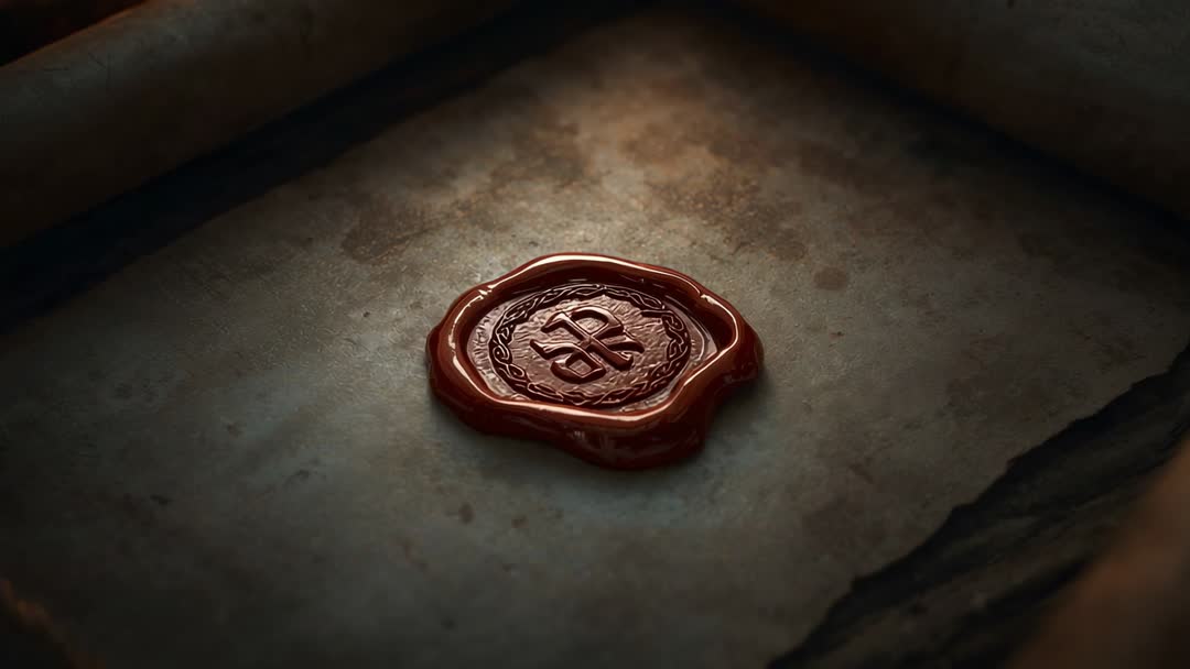 AI Generated Image. Frame from video showing red wax seal cooling on aged parchment inside shallow wooden tray. Close-up composition featuring embossed emblem with braided border and glossy molten edges solidifying. Warm directional lighting highlighting texture, patina, and subtle surface imperfections on vellum. Slow macro movement capturing fine engraving detail and wax ripple. Working well for historical title sequences, period drama openers, brand identity promos, stationery product presentations, and heritage packaging campaigns. Looping clip creating atmospheric background for website hero sections, social media reels, and digital galleries. Suitable for mockups of certificates, official letters, artisan branding, boutique law firm marketing, and film prop reference. Editable negative space around subject allowing overlay text or logo placement. Color palette featuring deep red, warm brown, muted gray, and aged parchment tones. High detail making clip useful for print, 4K video, and commercial motion design. Optional sound design suggestion: soft wax crackle and low ambient room tone for added authenticity.