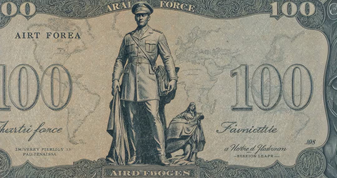 AI Generated Image. Imagined banknote features an engraved officer, overlaid on global map, suggesting currency of unknown future. Inspired by antique currency design, demonstrating style, symbolism. Ideal for educational purposes, artistic wall designs, financial storytelling projects, imaginative documentaries or publications exploring imagined history or futures.