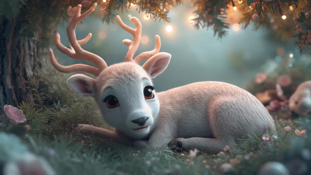 AI Generated Video. Resting in mossy forest glade under twinkling fairy lights, antlered fawn emitting soft twilight glow and delicate bokeh highlights. Displaying velvety fur texture, big expressive eyes, and gentle pose, suiting family-friendly storytelling and fantasy scenes. Serving charming loop for childrens book animation, holiday greeting video, nursery decor, social media storytelling, seasonal advertising banners, and background for nature conservation campaigns. Featuring pastel teal and warm amber palette, soft focus foreground, and cinematic shallow depth, creating cozy magical atmosphere for motion designs, title sequences, and promotional reels.