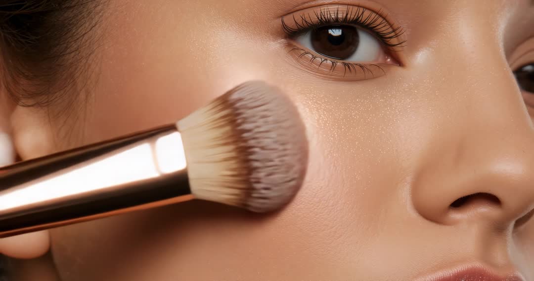 AI Generated Image. This visual focuses on applying gleaming makeup using a precise brush on a woman's cheek, creating a radiant glow emphasizing skincare routines. Excellent for beauty editorials, makeup tutorials, or advertising skincare products. Reflects elegance, glamour, and a commitment to skin enhancement and cosmetics techniques.