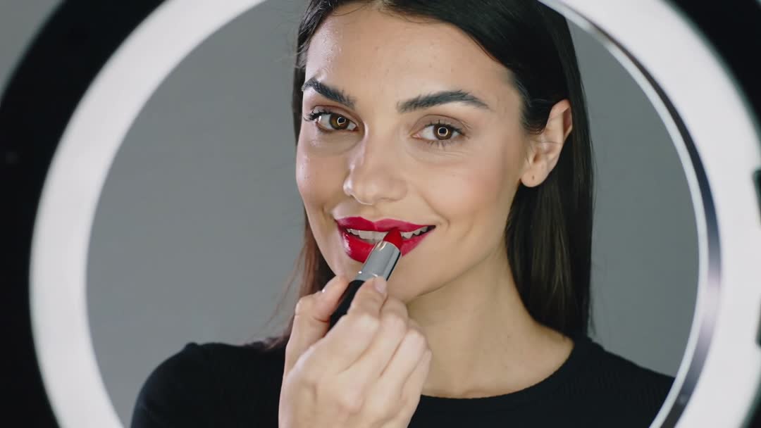 AI Generated Video. Scene showing woman applying red lipstick while looking into ring light, close-up on lips and face against neutral gray backdrop. Lighting producing soft even skin tone and bright catchlights in eyes. Hand holding silver lipstick tube applying product to upper lip while model smiling slightly and checking finish in ring light reflection. Composition focusing on lip color, texture, precision of application, and natural skin details. Usage ideas: - Promoting lipstick products and cosmetic brand campaigns - Creating beauty tutorial thumbnails and makeup lesson videos - Producing influencer reels, vlog intros, and social media content - Designing e-commerce banners, product pages, and packaging visuals - Enhancing editorial beauty features, blog headers, and advertising spots - Building makeup artist portfolios and online course previews Technical notes: horizontal video frame, shallow depth of field, studio lighting with ring light catchlights, high-resolution footage suitable for close-up editing and product showcase.