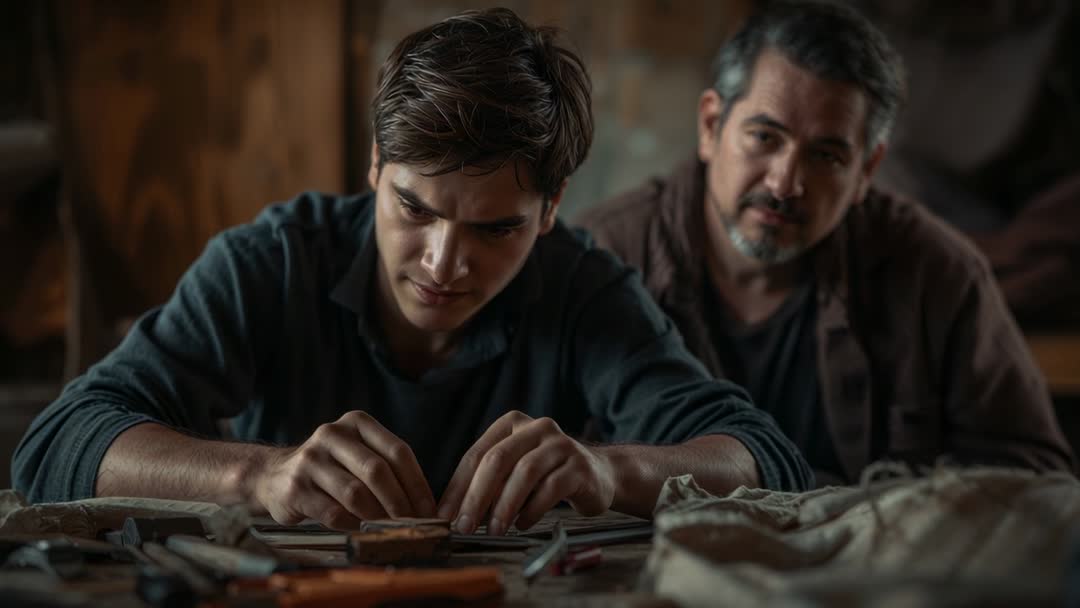AI Generated Image. Showing young apprentice aligning wood piece on bench while mentor watching closely. Featuring hands-on close-up footage highlighting precision, concentration, and technique during joinery work. Using warm, rustic lighting to create intimate, craft-focused mood. Suiting woodworking tutorial videos, online course lessons, apprenticeship program promotion, small business marketing for carpentry shops, social media reels about craftsmanship, documentary segments on traditional trades. Pairing with voiceover about skill transfer, safety tips, tool techniques, or company story. Offering crop-friendly composition for hero video banner, timeline clip for long-form instructional content, or thumbnail for workshop registration page. Conveying mentor-pupil trust, patience, and hands-on learning.
