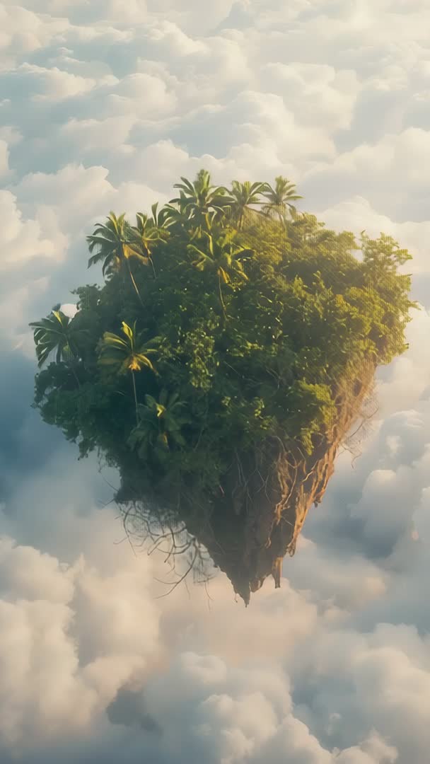 AI Generated Image. Vertical cinematic clip showing camera approaching floating triangular island suspended above clouds at sunrise, slowly revealing dense palm canopy and exposed roots. Soft golden light and pastel cloudscape creating tranquil, dreamlike mood. Serving title sequences, travel commercials, nature documentaries, meditation and wellness apps, fantasy book trailers, game environment showcases, environmental campaign visuals, social media reels and vertical ads. Working well as background for text overlays, lower thirds, app splash screens, hero headers and storytelling transitions. Pairing with ambient music, slow cinematic pacing, and color grading emphasizing warm highlights and soft shadows.