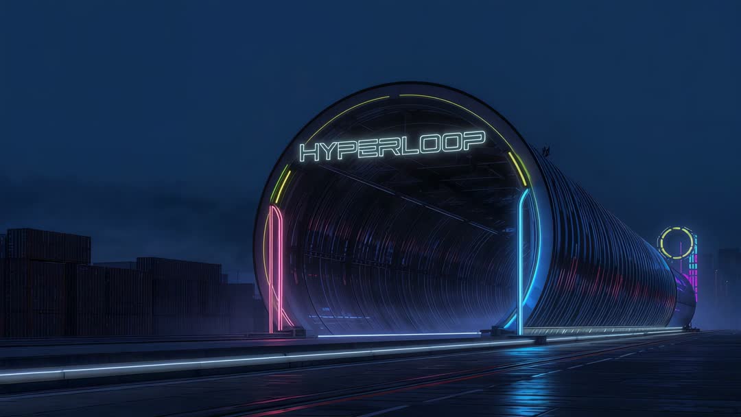 - Approaching Hyperloop Tunnel at Night with Neon Lights and Wet Track Reflections