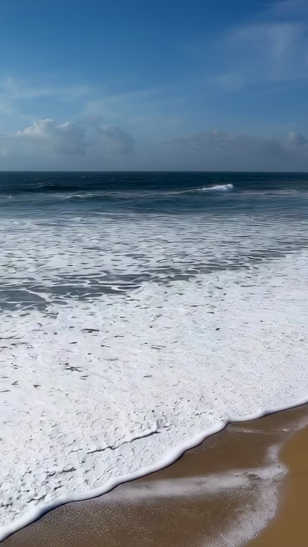 AI Generated Image. Vertical clip showing approaching ocean swell rolling in from horizon and exploding into spray while foamy surf washing over sandy shoreline. High-resolution motion capturing texture of whitewater, rhythmic wave patterns, and deep blue sky. Useful for background footage in travel promos, coastal tourism ads, relaxation and meditation apps, and social media reels or stories. Suitable for looping hero banners, nature documentaries, environmental campaigns about ocean health, and cinematic transitions. Leaving calm horizon and sky area for overlay text or branding. Applying slow-motion and color grading, enhancing drama and mood. Royalty-free stock video for creative projects, marketing, web design, mobile content, and editorial use.