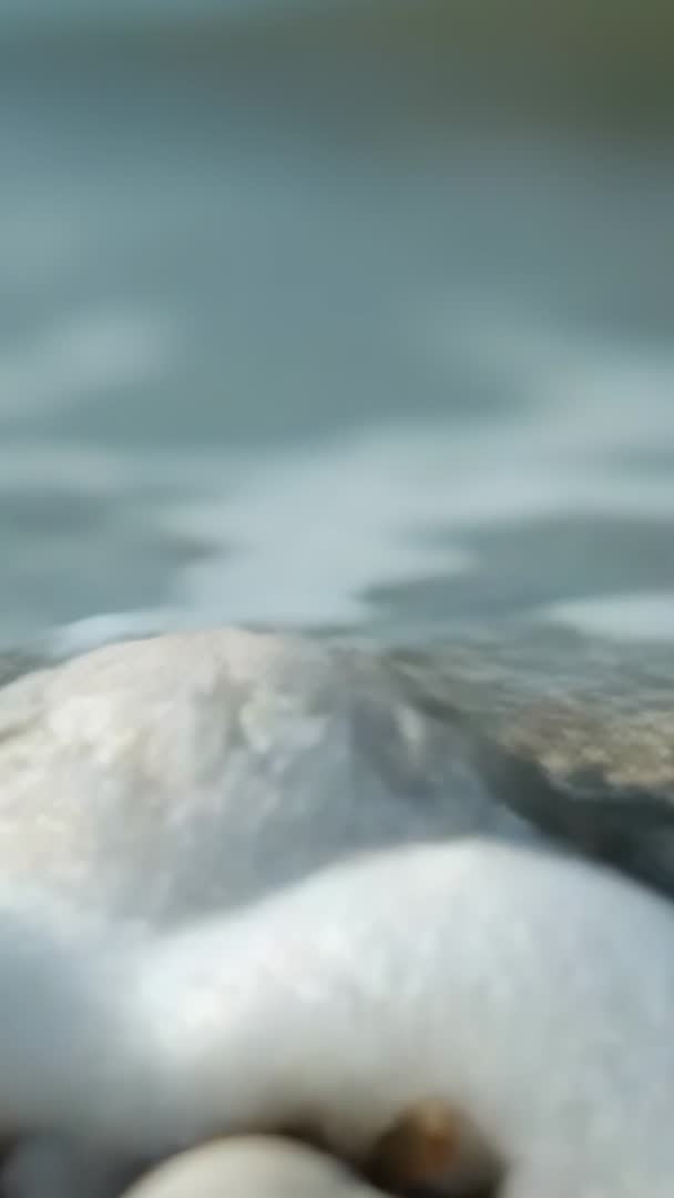 AI Generated Image. Closeup frame showing approaching wave gently enveloping ridged seashell resting on wet pebbles, capturing tide movement and foamy surf in shallow focus. Vertical composition emphasizing slow, meditative rhythm of ocean returning to shore, soft blue-green palette and tactile rock texture. Ideal for using as background loop for meditation and wellness apps, social media Reels or Stories, mobile wallpapers, travel and nature videos, landing page hero banners, environmental awareness projects. Suggesting pairing with calming ambient audio, overlaying short inspirational text, or using as transitional cut in documentary sequences.