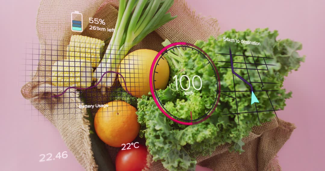 Video showing augmented reality overlays animating over burlap bag filled with fresh produce, capturing top-down flatlay. Overlays featuring magenta circular gauge pulsing at 100 km/h, battery icon showing 55% with 261 km left, navigation route indicating 54 km to destination, temperature readout 22°C, and battery usage graph. Scene highlighting lettuce and leafy greens, spring onions, corn on cob, oranges and tomato against pink background. Footage fitting tech demonstrations, smart retail presentations, AR grocery shopping concepts, food delivery tracking UI, mobile app interface mockups, and marketing campaigns for fresh produce or food tech startups. Useful for hero banners, explainer videos, pitch decks, social media ads, website backgrounds, product demos, and tutorial content. Overlay elements allowing brand color swaps, data customization, and caption insertion for seamless editing.