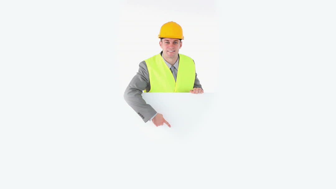 Architect wearing yellow safety helmet and vest pointing at empty board. Ideal for promoting construction projects, architectural services, and mockup presentations. Suitable for advertisements or educational material related to construction and engineering fields.