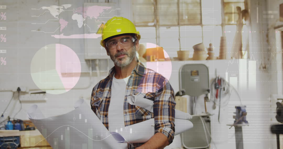 Architect wearing hardhat and glasses stands in modern office holding blueprints with digital data and statistics overlays around. Ideal for articles or advertisements about technological advancements in engineering and architecture, promotion of safety gear in industrial environments, or focusing on innovations in professional workspaces.
