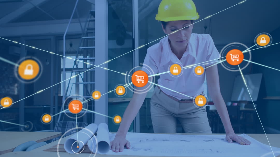 Image shows a female architect in a hard hat working on blueprints with digital network icons overlaying, symbolizing integration of technology in modern architecture and construction. Useful for illustrating articles on construction technology, architecture innovation, or educational materials on design integration.