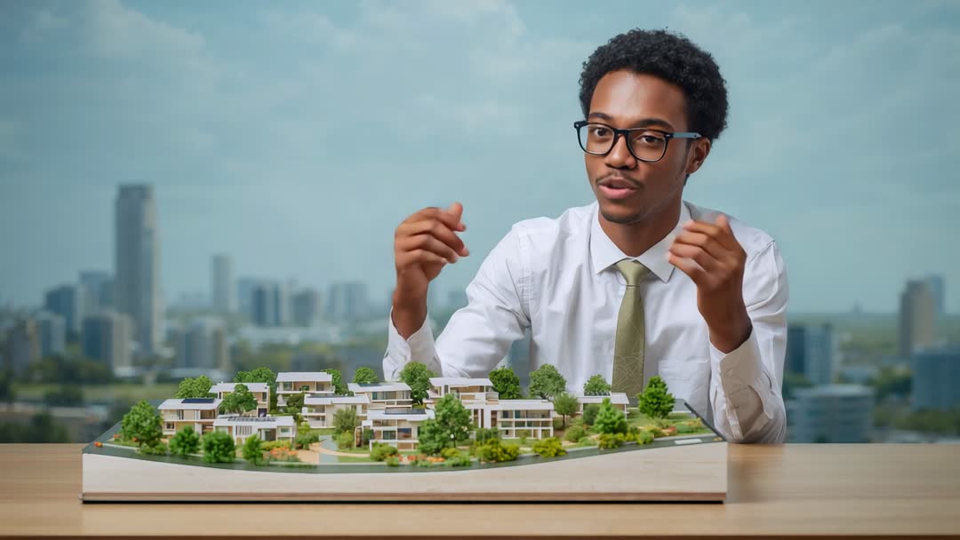 AI Generated Image. Video showing architect wearing shirt and tie leaning forward and gesturing over detailed scale model with blurred city skyline in background. Camera focusing on hands and model while speaker is explaining layout, circulation, landscaping, and building massing. Lighting appearing natural with shallow depth of field creating professional, informative mood. Footage working well for real estate marketing, architecture firm showreels, investor pitch presentations, urban planning documentaries, corporate training, and website hero banners. Clip also fitting social media short, broadcast B-roll, slide deck background, and educational material illustrating masterplan review, design consultation, or property development proposal.