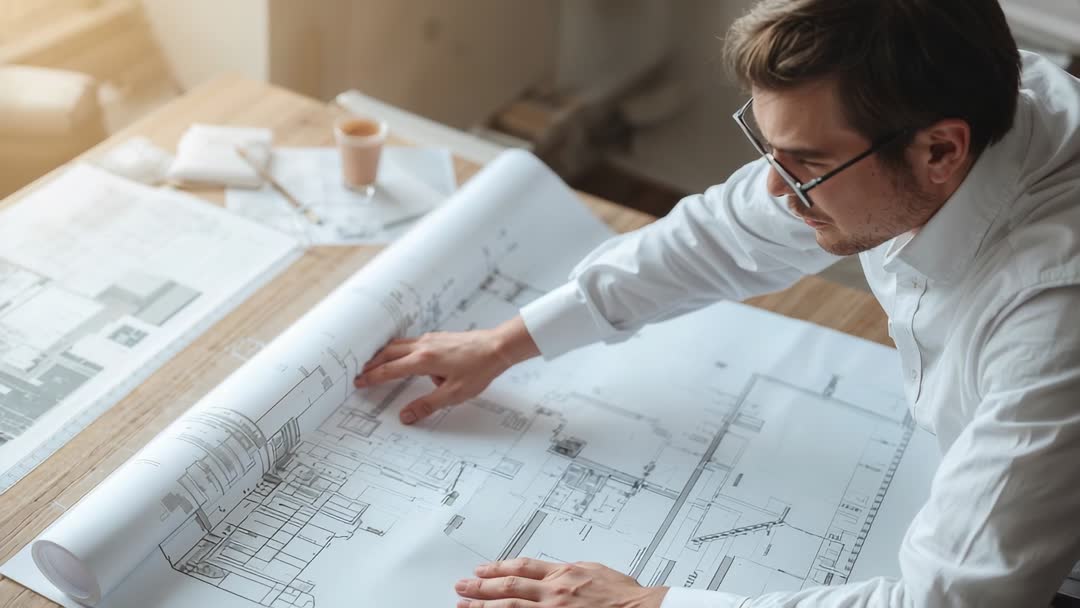 AI Generated Image. Video showing male architect wearing glasses and white shirt unrolling and tracing large blueprint across wooden desk, focusing on technical drawing details. Camera capturing close-up of hands and plan with shallow depth of field, warm natural light, soft background blur, generous copy space for text or graphics. Use for architectural firm promo videos, construction project presentations, engineering tutorials, design process features, corporate website hero clips, social media posts, online course modules. Suggested edits: add animated callouts, timeline overlays, voiceover narration, lower-third title, subtle music underscore, slow pan or hard cut to room overview. Licensing friendly for editorial, commercial, corporate use.