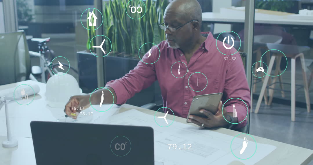 Architect is analyzing blueprint while using digital tablet. Various digital icons overlay the scene, indicating themes such as technology, sustainability, and environmental awareness. This can be used in contexts related to smart technology, green building design, innovative solutions in architecture, and business professional life.