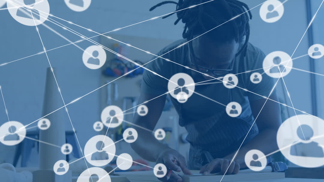 Architect engrossed in work surrounded by digital connection symbols. Perfect for illustrating themes of global connectivity, technological innovation, architecture, and collaborative working environments.