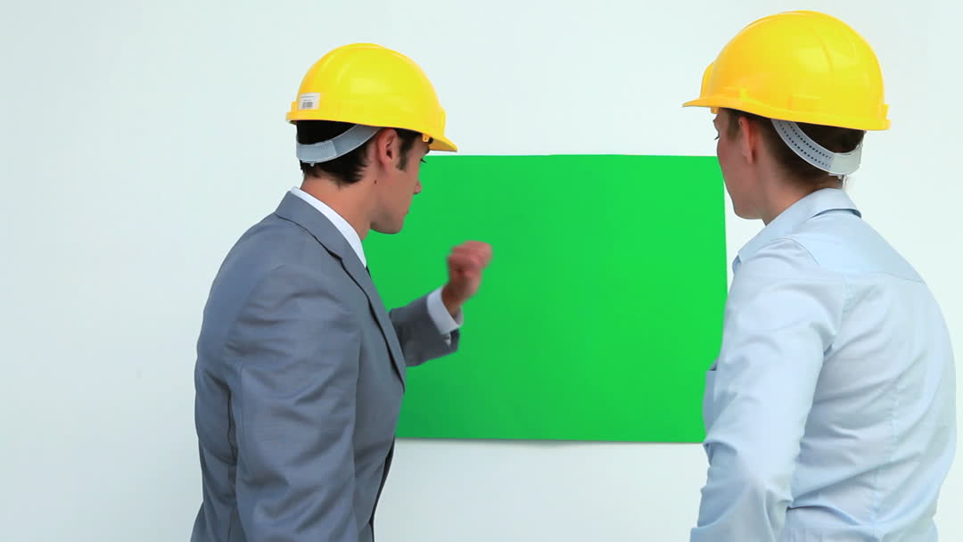Two architects wearing safety helmets are engaged in a discussion, pointing at a blank green space on the wall. This video typifies a collaborative environment in the construction industry, showcasing teamwork and planning. Ideal for use in materials emphasizing architectural design, construction services, project management, and teamwork concepts.