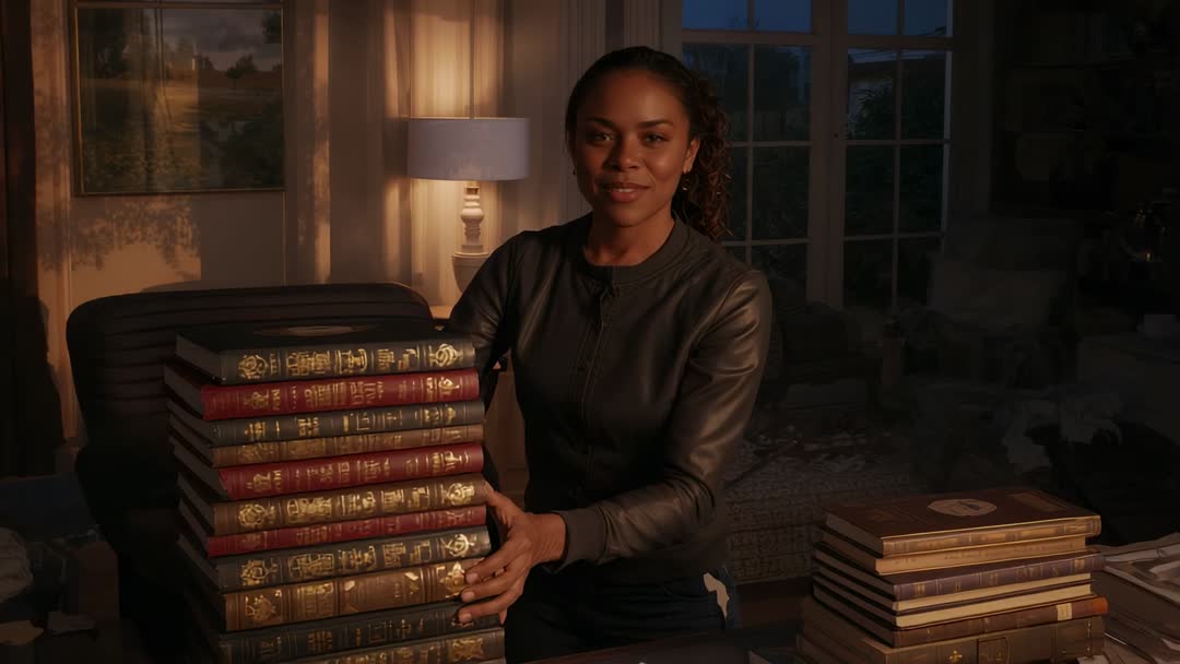 AI Generated Video. Video clip showing woman steadying tall stack of ornate leatherbound volumes in cozy study at dusk, warm lamp light casting soft shadows across gilded spines. Hands gripping spines, fingers tracing intricate tooling, conveying careful handling, preservation, and collector pride. Composition emphasizing tactile detail and silent narrative, suitable for archival storylines, heritage documentaries, bookshop promotions, and lifestyle features about reading culture. Use for background b-roll, opening sequences, cutaway shots, interview support, or thumbnail visuals for editorial pieces on rare books and conservation. Best used with gentle color grading to enhance warm tones and shadow detail, adding subtle vignette for cinematic mood. Licensing suggestions include editorial and commercial use for publishing marketing, museum and library outreach, educational content on conservation and cataloging.