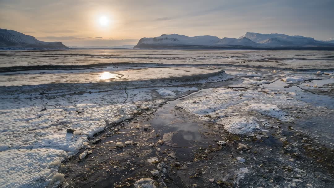 <a target="_blank" href=https://pikwizard.com/video/arctic-low-tide-with-sun-reflecting-on-icy-waterscape/b915d2077e4149e625fa921839c3d465/>PikWizard</a>