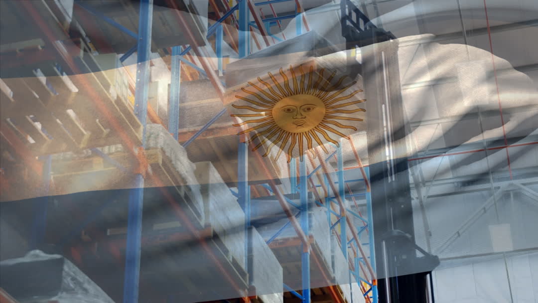 Image depicts Argentina's flag superimposed over a warehouse interior showcasing global shipping concepts. The focus is on logistics and supply chain with the national emblem symbolizing Argentinian commerce. Ideal for use in discussions about international trade relations, economic activities in Argentina, and logistics industry promotions. Can support articles or presentations on global shipping networks and national economic strategies.