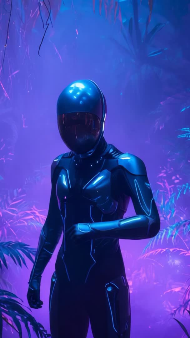 AI Generated Image. Vertical sci-fi clip showing armored explorer raising arm and reading wrist device while moving through neon-lit forest filled with glowing flora and mist. Cinematic lighting and vivid purple-blue palette creating mysterious, otherworldly mood and high-tech atmosphere. Useful for tech promo, game trailer, film title sequence, social vertical ads, app intro, concept showcase, or streaming thumbnail. Composition working well as background for UI mockups, motion graphics, or editorial on wearable technology and exploration themes. Licensing allowing commercial and editorial use across websites, presentations, social channels, and broadcast.