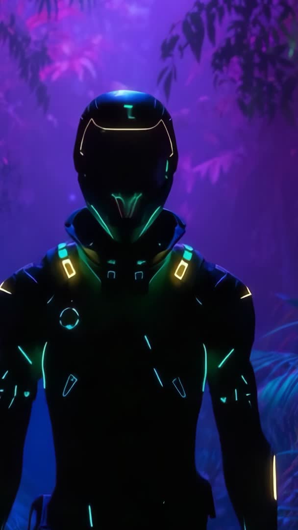 Armored Scout Exploring Neon Jungle Pulsing Neon Tracers Futuristic Vertical Sci-Fi Video