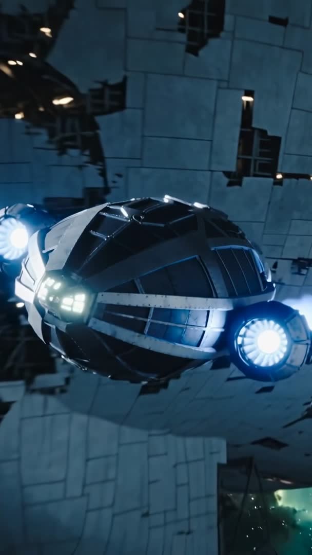 AI Generated Image. Showing armored shuttle exiting docking bay and thrusting into open space while passing derelict orbital sphere. Thrusters glowing blue and hull panels reflecting nearby debris and nebula light, camera framing emphasizing vertical ascent and forward motion. Suitable for mobile-first vertical content, trailer openers, game intros, cinematic VFX reels, or futuristic tech promos. Providing strong hero shot for title sequences, social video ads, streaming thumbnails, and book or poster covers. Allowing text overlay at top or bottom and leaving central area for subject focus. Recommending color grade tweaks for contrast and adding subtle motion blur for enhanced speed effect.