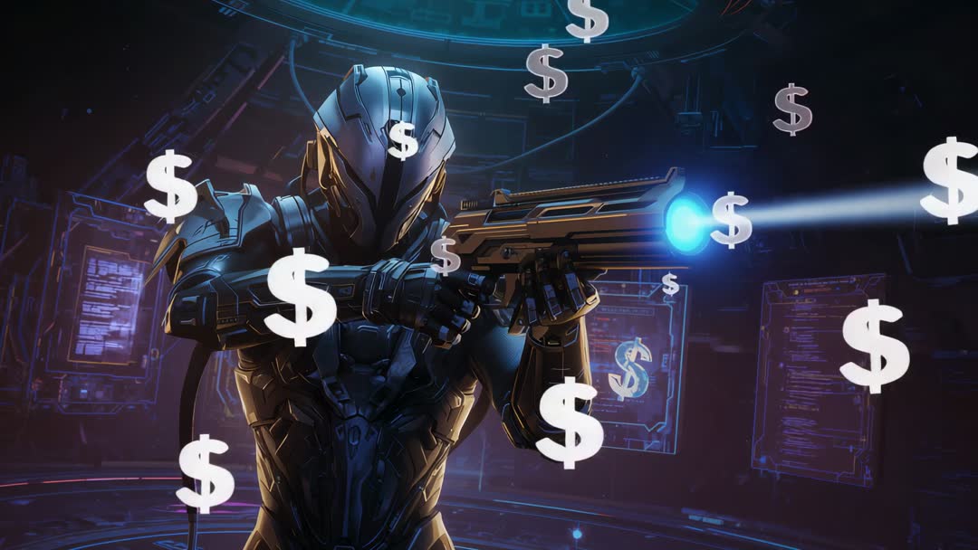 AI Generated Image. Scene depicts an armored soldier exerting futuristic influence with weapon triggering economic overtones. Floating dollar symbols symbolize modern digital credit dynamics in a high-tech control environment. Ideal for use in representations of futuristic technology, cybersecurity innovations or speculative digital and virtual economies.