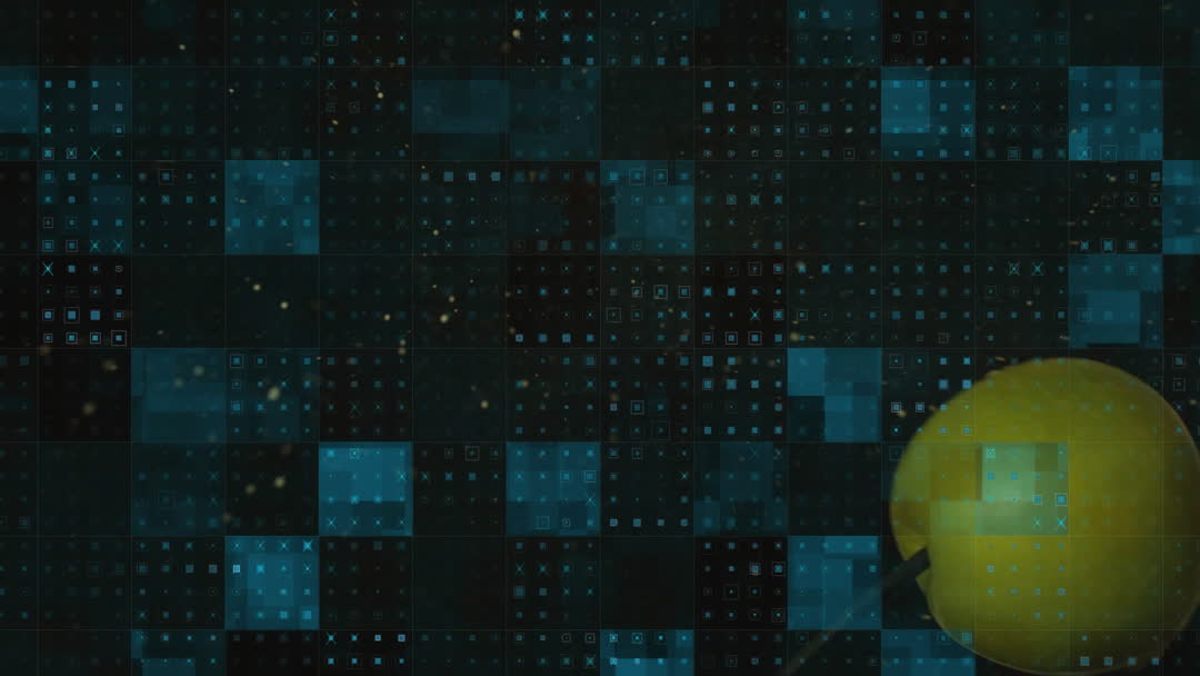 Animation depicts an arrow piercing a Granny Smith apple against a background of digital squares and dots. Symbolizes precision, accuracy, and a fusion of natural elements with technology. Useful for illustrating concepts in technology aiming for accuracy, health and technology integration, or educational purposes demonstrating symmetry and aim.