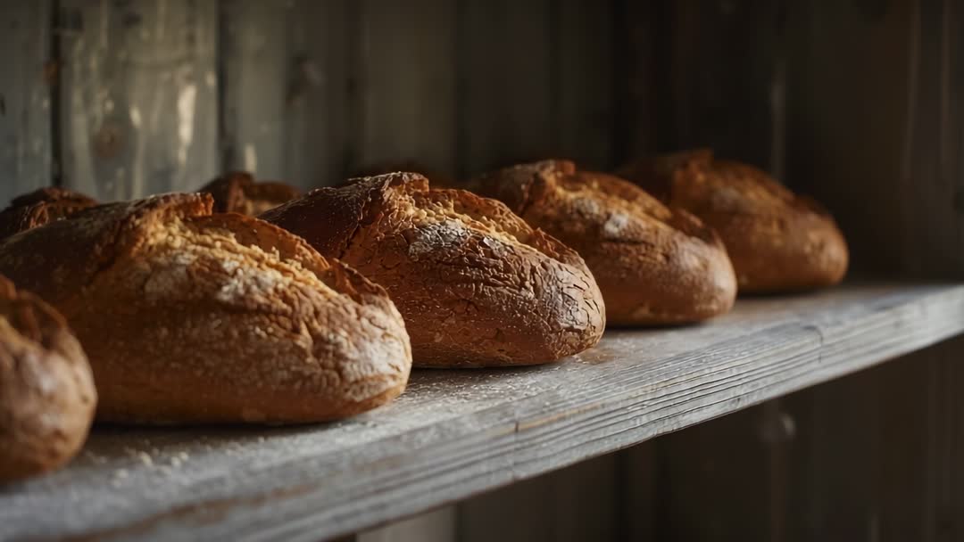 AI Generated Image. Camera moves smoothly revealing artisan loaves lined up on a wooden shelf, their rustic texture enhanced by a dusting of flour. This setting highlights the craft and tradition of baking, suitable for culinary magazines, blogs on bread-making, and food-related advertising materials.