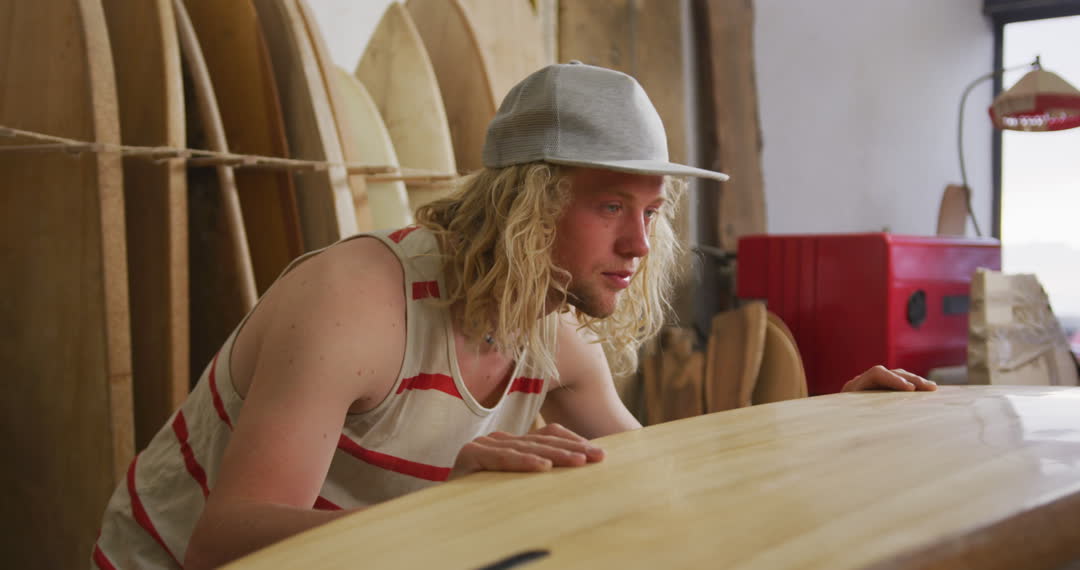 A young male surfboard maker, wearing a casual tank top and cap, intensely inspects his surfboard in a bright, rustic workshop adorned with other boards. This depiction highlights the dedication and skill involved in handcrafted workmanship. Useful for articles or promotions about artisanal skills, surfing culture, or creative craft industries.