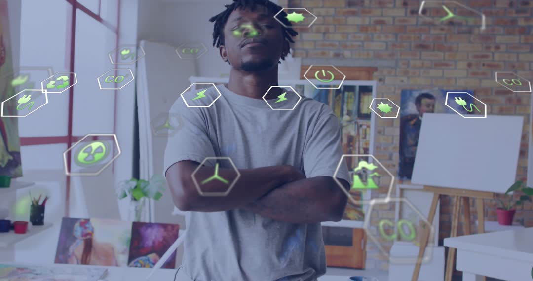 An artist standing confidently with arms crossed in a creative art studio embraces futuristic digital green icons symbolizing eco-friendly technology and sustainability. The transparent floating symbols blend the digital and creative worlds, demonstrating innovation, environmental awareness, and modern technology trends. Perfect for concepts of sustainable art practices, technological advancements in environmental solutions, or creative expressions of modern eco-consciousness.