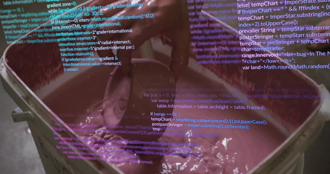 This scene features an artist stirring vibrant pink paint while a digital code interface scrolls across. The video captures a convergence of traditional artistic practice with modern technological innovation. This symbolizes creativity and the integration of tech in art, making it ideal for projects exploring the synergy of art and technology, workshops related to digital artwork or presentations on innovative practices in the art world.