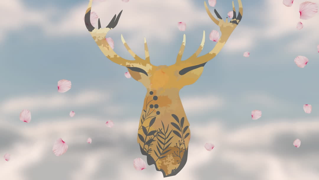 Stylized deer silhouette with integrated floral motifs symbolizes nature and wildlife. The soft cloud background and falling petals enhance the serene, natural atmosphere, suitable for wall art, eco-friendly branding, or lifestyle blogs.