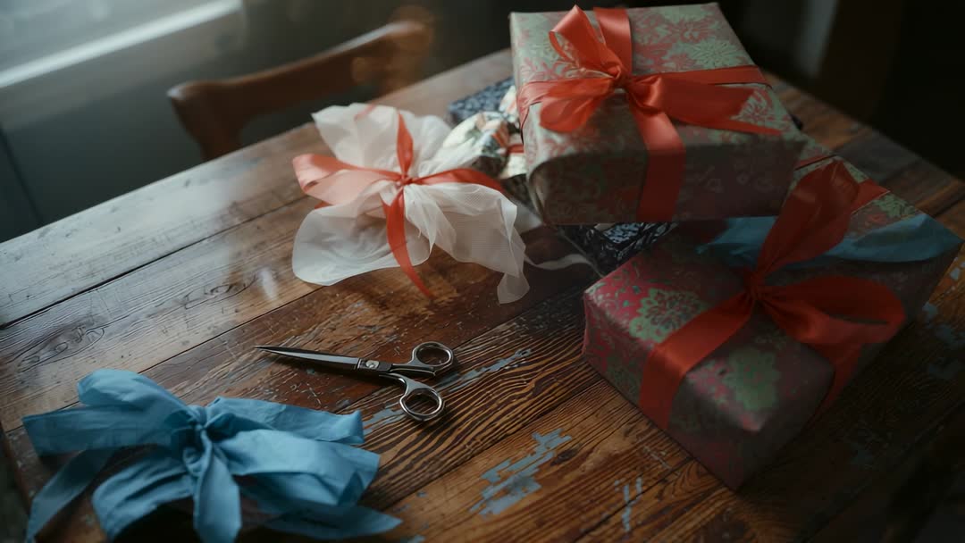 - Artistic Gift Wrapping on Rustic Wooden Table by Sunlit Window
