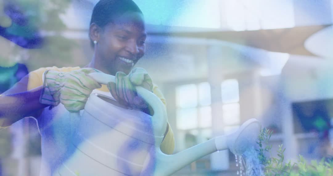 An engaging composition featuring someone tending to plants while visually captivating abstract blue animations overlay the scene. This blend embodies the spirit of creativity and gardening, showcasing the harmony between human care and nature. Useful for themes related to growth, sustainable living, and creative visual arts, especially in gardening blog posts, eco-friendly branding and marketing materials.