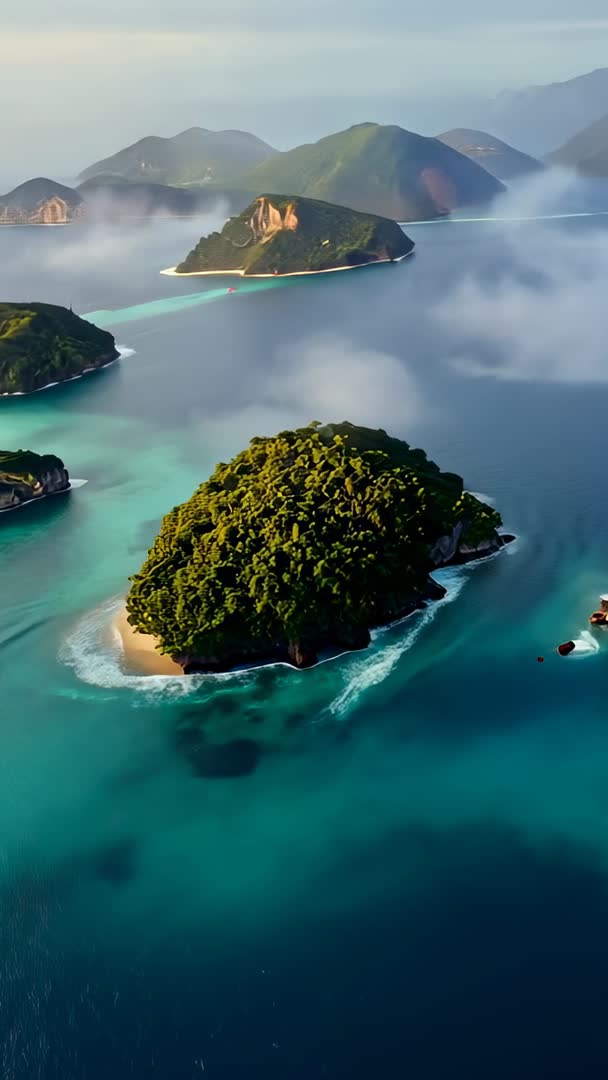 AI Generated Image. Ascending drone revealing mist-covered island chain with turquoise lagoon, white sand beach and coral reef edges. Featuring lush green canopy, secluded shoreline and shallow reef patterns visible through crystal water. Serving travel promos, tourism ads, resort marketing, social media vertical reels and mobile wallpapers. Providing cinematic opening shot for documentaries, nature films and adventure tourism content while enhancing wellness branding and retreat campaigns. Applying slow motion, ambient soundtrack or text overlay to emphasize tranquil mood and create immersive viewer experience. Optimizing frame for 9:16 social formats, parallax effects or widescreen crop for cinematic sequences.