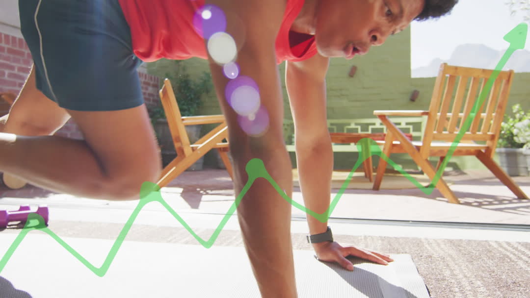 This visual shows an African American man engaged in an outdoor workout while a digital animation of a green ascending graph overlays. It represents growth, progress, and fitness goals. The setting suggests a focus on combining physical activity with data analytics, making it suitable for promotions related to healthy living, sports technology, or fitness applications.