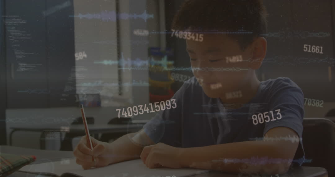 Asian Boy Immersed in Studying with Digital Numbers Overlay Video