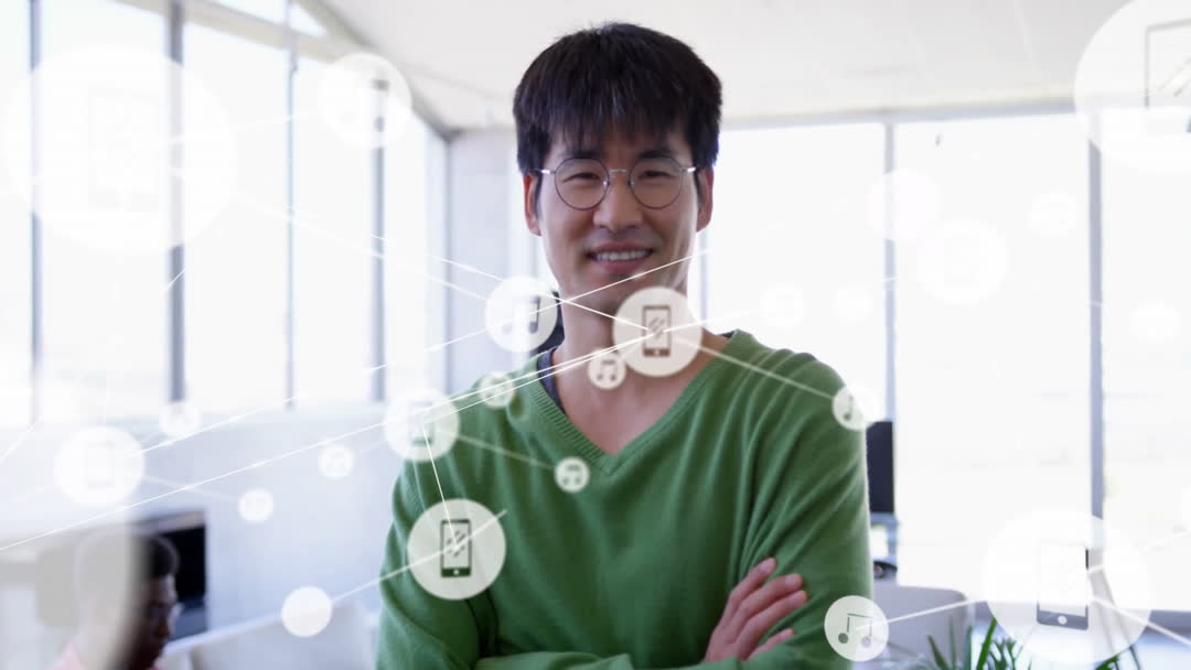 A smiling Asian businessman stands confidently with arms crossed in a modern office, illustrating a network of digital icons around him. This visual embodies themes of connectivity, technology in business, and efficiency. Ideal for use in promoting innovative business solutions, startup ideas, team introductions, or digital enterprise services.