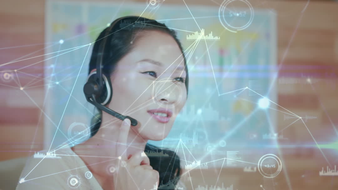 Asian Businesswoman with Headset and Digital Network Overlay Video