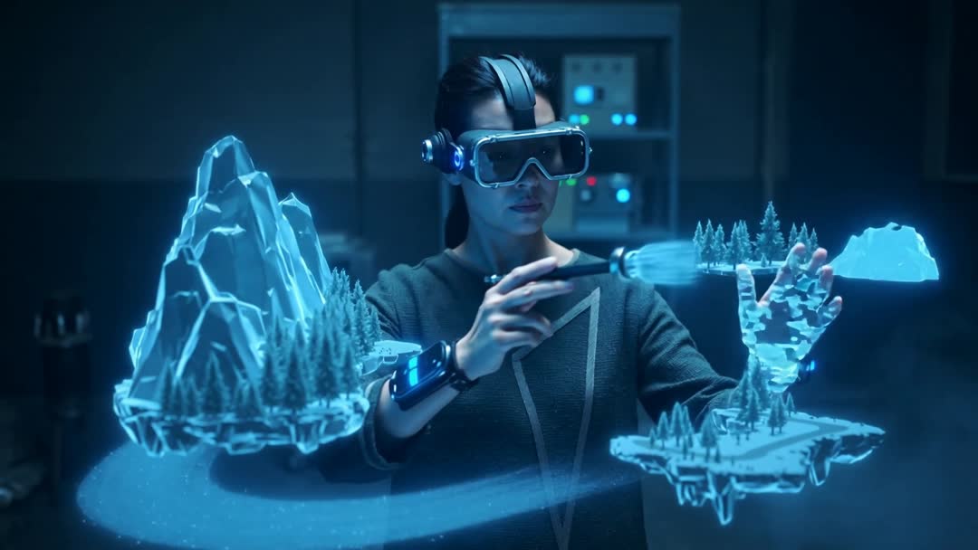 AI Generated Image. Video showing Asian female engineer wearing mixed reality visor and smart glove, refining holographic floating islands with stylus inside dim tech lab. Scene featuring glowing blue holograms, precise hand gestures, and wearable controllers, conveying advanced spatial computing and human-computer interaction. Ideal for technology presentations, startup pitch decks, product pages, training materials, research demonstrations, and sci-fi trailers. Use for UX case studies, AR/VR feature demos, educational content on spatial design, and marketing campaigns promoting immersive hardware or software. Frame offering clean negative space for on-screen copy, lower-third overlays, and interface mockups. Color palette and lighting supporting futuristic, high-tech mood.