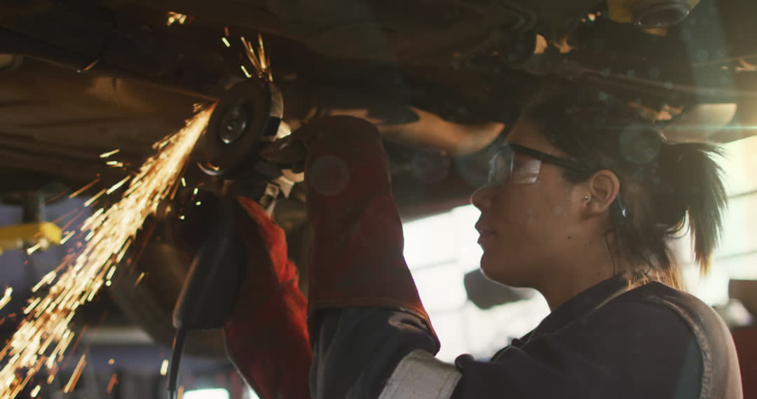 Profile side view of Asian female mechanic operating grinding wheel under a car with visible sparks. Demonstrating skilled labor, mechanical expertise, and maintenance work in an automotive workshop. Useful for illustrating concepts of gender diversity in mechanically skilled professions, auto repair stories, or industrial process depictions.