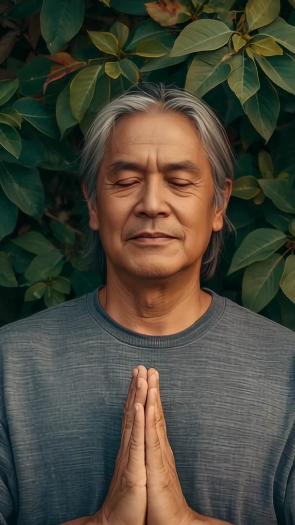 AI Generated Image. Showing Asian man closing eyes and pressing palms together at chest while meditating outdoors among lush leaves. Featuring vertical video orientation, close-up framing, natural soft light, muted color palette, casual gray tee. Conveying mindfulness, inner calm, breathing awareness, spiritual practice, gentle stillness. Ideal for wellness campaigns, meditation app intros, guided breathing sessions, yoga class promos, mindfulness social ads, mental health content, corporate stress-relief programs. Working well as hero clip for websites, loopable background for mobile apps, Instagram Reels, TikTok, YouTube Shorts, guided audio overlays, or training materials. Providing authentic, age-inclusive representation and calming visual focal point for brand storytelling.