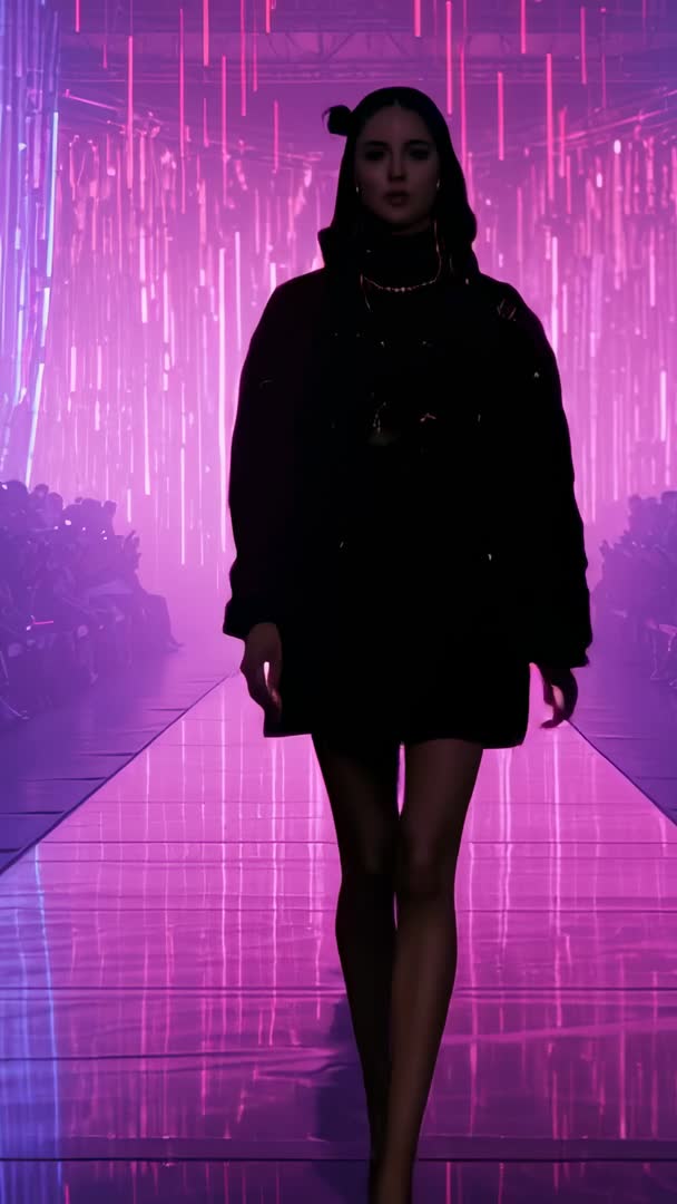 AI Generated Video. Vertical fashion video showcasing Asian model striding down pink LED-lit runway with lighting cues starting. Silhouette emerging from magenta haze, neon tubes creating rhythmic vertical lines and reflective runway surface amplifying glow. Camera tracking model in portrait orientation, delivering mobile-first cinematic experience. Mood blending futuristic glamour, edgy streetwear, high-fashion editorial energy. Usage ideas: Using for fashion show promos, brand lookbook reels, social media stories and reels, event teaser trailers, music video backdrops, lighting design portfolios, runway recap edits. Pairing with bold sans-serif typography for title cards, adding lower-third credits or product tags, applying slow-motion segments to emphasize walk and silhouette, looping short sections for background visuals at events or retail displays. Recommending sound design with deep bass and synth pads, color grading to enhance magenta and cyan contrast, exporting in 9:16 aspect ratio for vertical platforms.