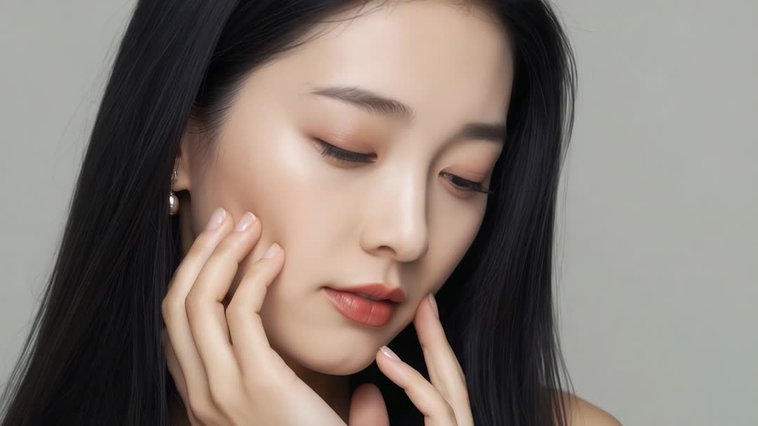 AI Generated Image. Showing serene expression, turning head slightly toward camera and touching cheek with fingertips, closeup beauty video capturing soft, natural makeup and smooth porcelain skin. Soft, even lighting and neutral gray background emphasizing facial contours, pearl earring, and manicured nails. Ideal for use in skincare and cosmetic campaigns, makeup tutorial videos, beauty vlog thumbnails, product packaging, and editorial sequences. Also suitable for jewelry advertising, spa and wellness content, social media banners, and lifestyle websites. Footage working well with copy about hydration, gentle formulas, minimal makeup, confidence, and self-care. Providing option for color grading to match brand palette and for cropping to tighter framing for product-focused shots.