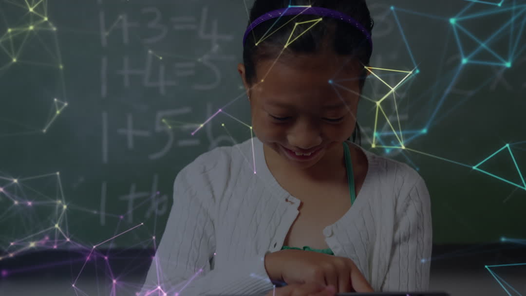 This visual shows an Asian schoolgirl smiling as she uses a tablet in an educational environment. Behind her is a blackboard with simple equations, overlayed with styled digital connections, symbolizing modern educational technology and the integration of learning with creative digital interfaces. This would be perfect for use in content about futuristic educational methods, online learning, and technology in classrooms.