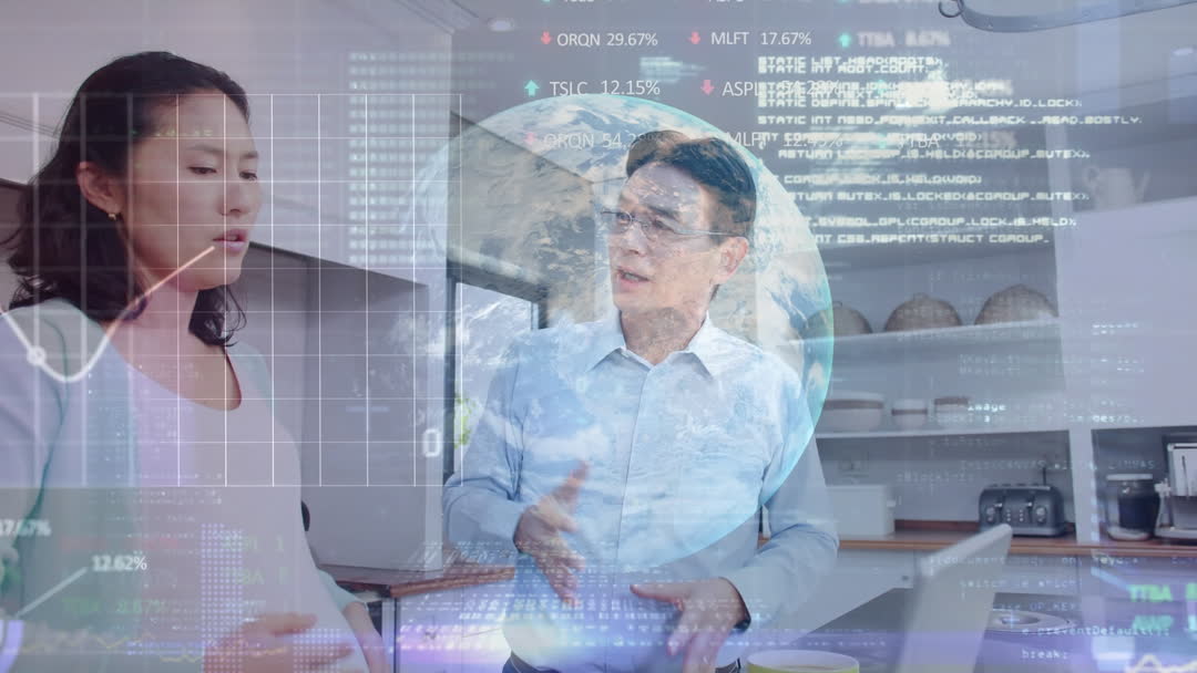 Two Asian professionals engage in discussion, surrounded by digitally generated data and a globe, representing modern business environment. This video conveys themes of global collaboration, technological advancement, and strategic planning useful for business presentations, tech industry websites, or financial reports.